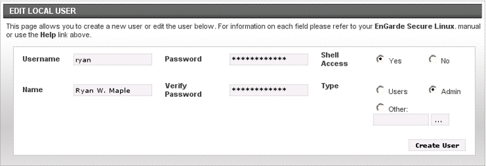 By the end of this section the reader will have created one group and one local user suitable for uploading files to your EnGarde Secure Linux server via FTP.