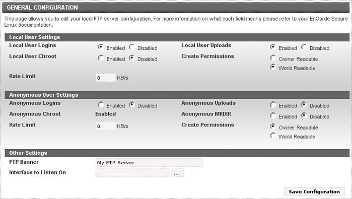 This option allows you to restrict the FTP service to a specific interface. If your are running EnGarde Secure Linux on a dual-interface machine and one of them is an "internal" interface, and only internal users should be able to access the FTP service, select your internal interface here.