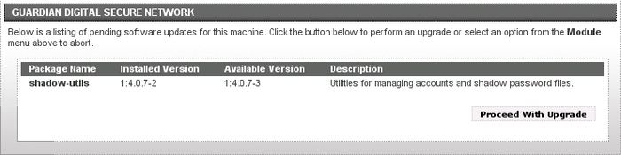 Begin by logging into the Guardian Digital WebTool, choose Guardian Digital Secure Network from the System menu, and then choose Update Agent from the Module menu. The agent will contact Guardian Digital and download the latest list of available packages and if there are any updates available you will see a screen like the one in Figure 6-20: