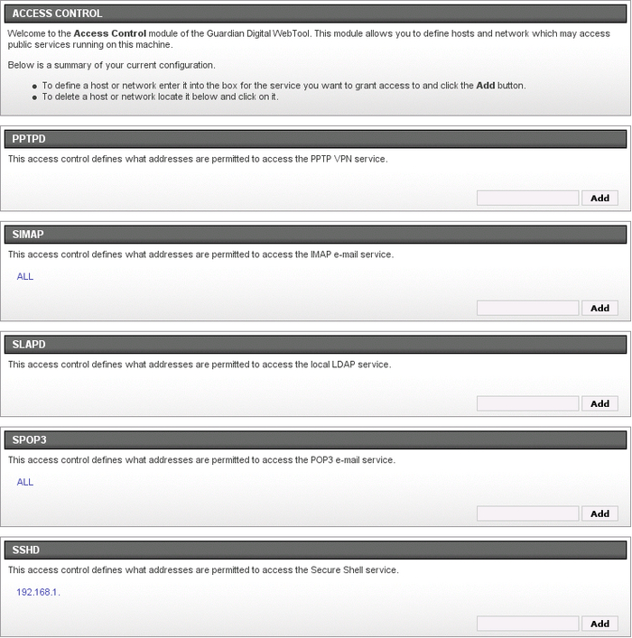 Log into the Guardian Digital WebTool, and click System menu item, then click the Access Control option and you'll be presented with a screen like the one in Figure 6-3.