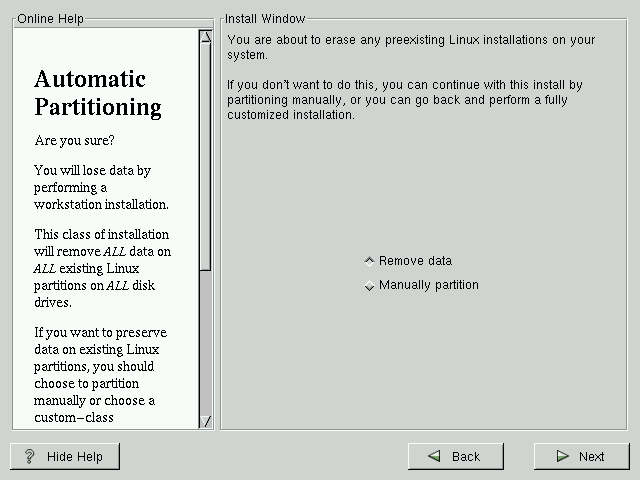 The Automatic Partitioning screen is only seen when performing a workstation- or server-class installation. If you are performing a custom-class installation, or choose to manually partition, please refer to the section called Partitioning Your System.