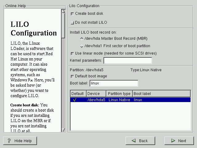 In order to be able to boot your Red Hat Linux system, you usually need to install LILO (the LInux LOader). You may install LILO in one of two places: