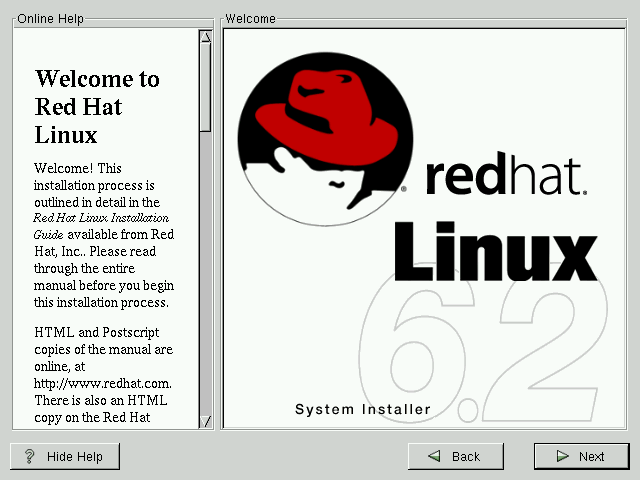 The "Welcome" screen (see Figure 5-4) does not prompt you for any installation input. Please read over the help text in the left panel for additional instructions and information on where to register your Official Red Hat Linux product.