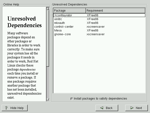 The Unresolved Dependencies screen will only appear if you are missing certain packages that are needed by your customized package selection. Under the list of missing packages, there is an Install packages to satisfy dependencies check box at the bottom of the screen which is selected by default. If you leave this checked, the installation program will resolve package dependencies automatically by adding all required packages to the list of selected packages.