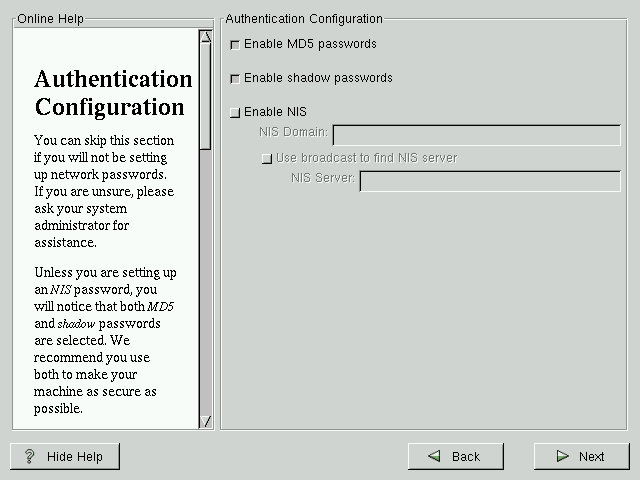 Unless you are setting up NIS authentication, you will notice that both MD5 and shadow passwords are selected (see Figure 4-13). We recommend you use both to make your machine as secure as possible.