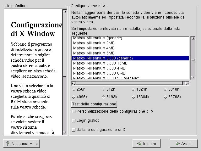 Se decidete di installare i pacchetti del sistema X Window, potete configurare il server X (la parte grafica del sistema).