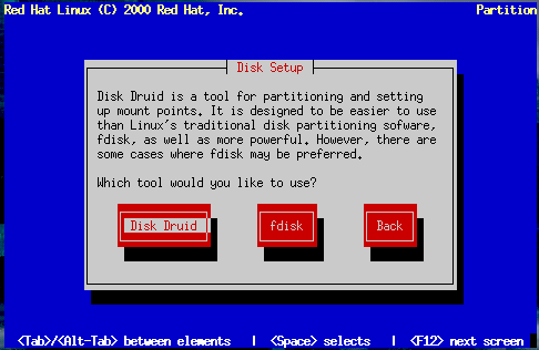 If you will be using fdisk to partition your drive, please see the section called Using fdisk for those instructions. If you select Disk Druid, continue reading below.