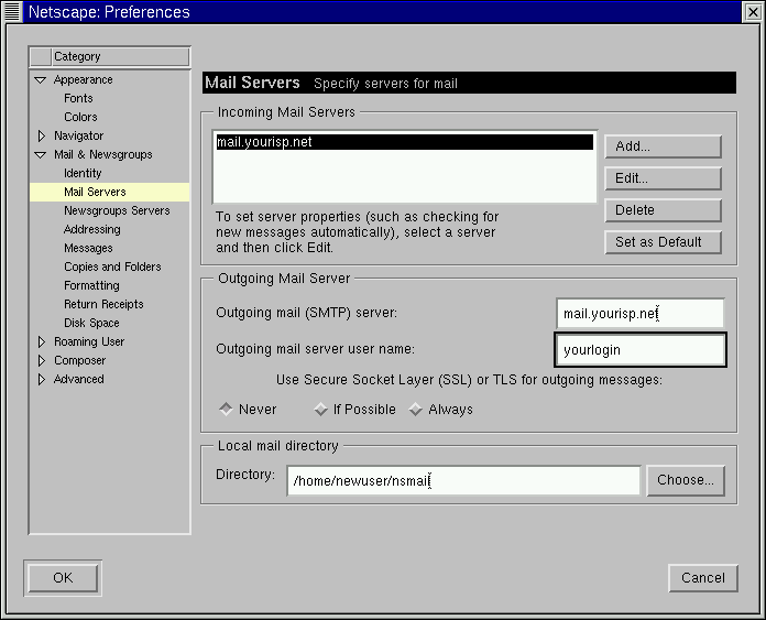 Potete specificare dove la vostra posta deve venire conservata inserendo la posizione in Local mail directory, oppure premendo il tasto Choose, e selezionando una directory nella finestra del browser. Di default la posta verrà inviata in una directory all'interno della home dell'utente; se il vostro nome è newuser, per esempio, il percorso della directory è /home/newuser/nsmail.
