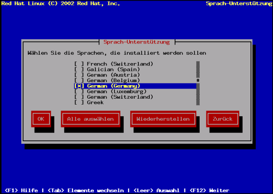 Um mehr als eine Sprache auf Ihrem System zu benutzen, wählen Sie die spezifischen Sprachen, die installiert werden sollen, oder wählen Sie alle Sprachen, um sie alle auf Ihrem Red Hat Linux System zur Verfügung zu haben.