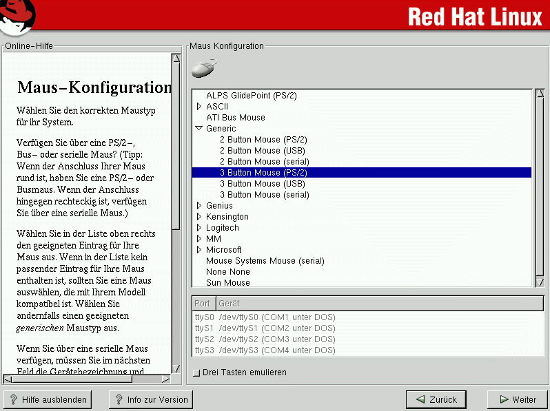 Wenn Sie eine PS/2 oder eine Bus-Maus haben, müssen Sie den Port und die Gerätebezeichnung nicht angeben. Wenn Sie eine serielle Maus haben, müssen Sie den richtigen Port und die Gerätebezeichnung wählen, an welchen Ihre serielle Maus angeschlossen ist.