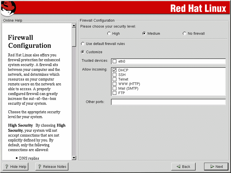 No firewall provides complete access to your system and does no security checking. Security checking is the disabling of access to certain services. This should only be selected if you are running on a trusted network (not the Internet) or plan to do more firewall configuration later.