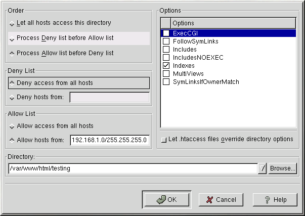 To specify options for specific directories, click the Add button beside the Directory list box. The window shown in Figure 14-7 appears. Enter the directory to configure in the Directory text field at the bottom of the window. Select the options in the right-hand list, and configure the Order directive with the left-hand side options. The Order directive controls the order in which allow and deny directives are evaluated. In the Allow hosts from and Deny hosts from text field, you can specify one of the following: