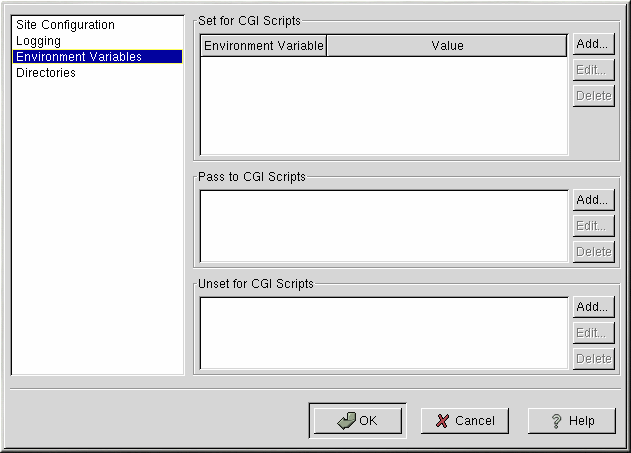 Use the Set for CGI Scripts section to set an environment variable that is passed to CGI scripts and SSI pages. For example, to set the environment variable MAXNUM to 50, click the Add button inside the Set for CGI Script section as shown in the section called Environment Variables and type MAXNUM in the Environment Variable text field and 50 in the Value to set text field. Click OK. The Set for CGI Scripts section configures the SetEnv directive.