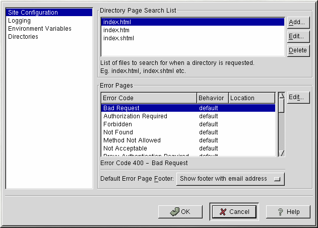 Use the Directories page to configure options for specific directories. This corresponds to the <Directory> directive.
