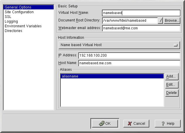 The General Options settings only apply to the virtual host that you are configuring. Set the name of the Virtual Host in the Virtual Host Name text area. This name is used by Apache Configuration Tool to distinguish between virtual hosts.