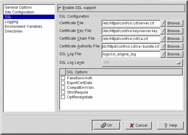 If an Apache server is not configured with SSL support, communications between an Apache server and its clients are not encrypted. This is appropriate for websites without personal or confidential information. For example, an open source website that distributes open source software and documentation has no need for secure communications. However, an ecommerce website that requires credit card information should use the Apache SSL support to encrypt its communications. Enabling Apache SSL support enables the use of the mod_ssl security module. To enable it through Apache Configuration Tool you must allow access through port 443 under the Main tab => Available Addresses. Refer to the section called Basic Settings for details. Then, select the virtual host name in the Virtual Hosts tab, click the Edit button, choose SSL from the left-hand menu, and check the Enable SSL Support option as shown in Figure 14-13. The SSL Configuration section is pre-configured with the dummy digital certificate. The digital certificate provides authentication for your secure Web server and identifies the secure server to client Web browsers. You must purchase your own digital certificate. Do not use the dummy one provided in Red Hat Linux for your website. For details on purchasing a CA-approved digital certificate, refer to the Chapter 15.
