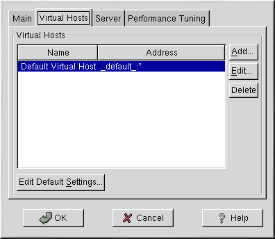 Apache Configuration Tool includes a default virtual host as shown in Figure 14-8. Refer to the section called Default Virtual Host for details about the default virtual host.