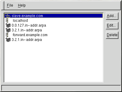 BIND Configuration Tool allows you to add a forward master zone, a reverse master zone, and a slave zone. After adding the zones, you can edit or delete them from the main window as shown in Figure 16-1.