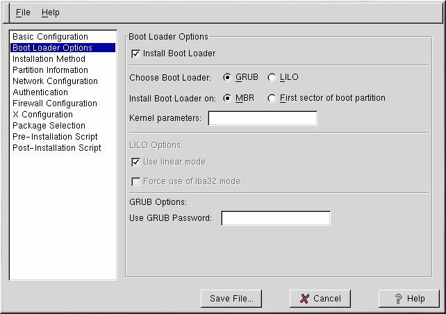 If you choose to install a boot loader, you must also choose which boot loader to install (GRUB or LILO) and where to to install the boot loader (the Master Boot Record or the first sector of the /boot partition). Install the boot loader on the MBR if you plan to use it as your boot loader. If you are using a different boot loader, install LILO or GRUB on the first sector of the /boot partition and configure the other boot loader to boot Red Hat Linux.