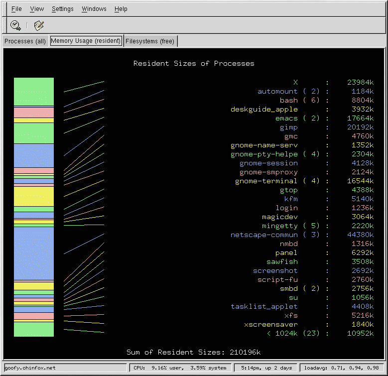 If you would like to use a graphical interface with free, you can use GNOME System Monitor. To start it, go to the GNOME Main Menu Button => Programs => System => System Monitor or type gtop at a shell prompt. Then choose the Memory Usage tab.