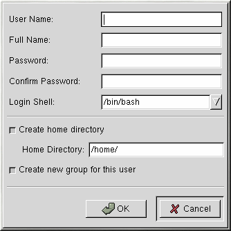 To add a new user, click the New User button. A window as shown in Figure 19-2 will appear. Type the username and full name for the new user in the appropriate fields. Type the user's password in the Password and Confirm Password fields. The password must be at least six characters.