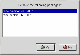Once you've begun to uninstall packages, Gnome-RPM asks for confirmation, showing a window like the one in Figure 26-11. All of the packages that are about to be uninstalled are listed. You should carefully check the list to make sure that you're not about to remove something you want to keep. Clicking the Yes button will start the uninstallation process. After it is completed, the packages and groups that have been removed will disappear from any open windows.