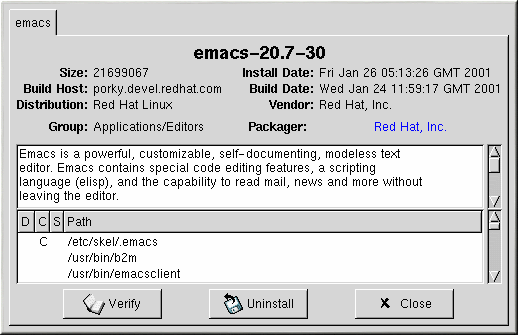 If you're querying a package that's already installed, you'll also find two additional buttons at the bottom of this window: Verify and Uninstall. If you're performing a query on a package that hasn't been installed yet, the buttons on the bottom will be labeled Install, Upgrade and Check Sig.