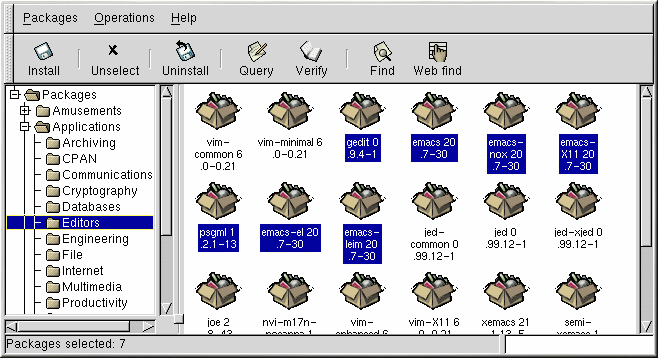 Each folder icon in the tree view at left represents a group of packages. Each group can contain subgroups. For example, the folder Applications contains the folder Editors that contains text editors such as Emacs, ed, vim, and GXedit.