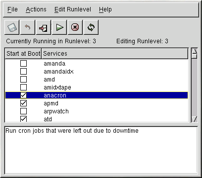 Serviceconf displays the current runlevel as well as which runlevel you are currently editing. To edit a different runlevel, select Edit Runlevel from the pulldown menu and select runlevel 3, 4, or 5. Refer to the section called Runlevels for a description of runlevels.