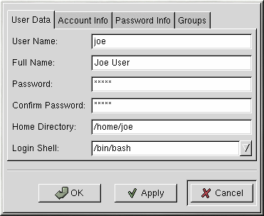 User Data — Basic user information configured when you added the user. Use this tab to change the user's full name, password, home directory, or login shell.