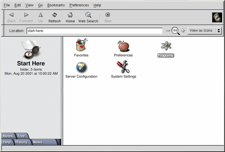 The Nautilus Start Here screen (Figure 2-2) opens automatically when you log in to GNOME. If you close the screen, you can open it again by clicking on one of the Start Here icons, located on the desktop and the panel, or by selecting Start Here from the GNOME main menu.
