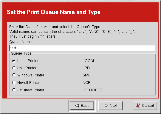 You will then see the screen shown in Figure 7-3. Enter a unique name for the printer in the Queue Name text field. This can be any descriptive name for your printer. The printer name cannot contain spaces and must begin with a letter a through z or A through Z. The valid characters are a through z, A through Z, 0 through 9, -, and _.
