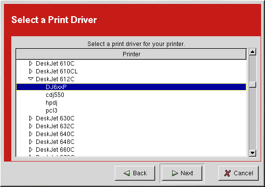 Next, printconf will try to detect which printer is attached to the printer device you selected as shown in Figure 7-5. If it detects the wrong printer or does not detect any printer, you can manually select one. The printers are divided by manufacturers. Click the arrow beside the manufacturer for your printer. Find your printer from the expanded list, and click the arrow beside the printer name. A list of drivers for your printer will appear. Select one. If you do not know which one to use, select the first one in the list. If you are having problems using that driver, edit the printer in printconf and select a different driver.