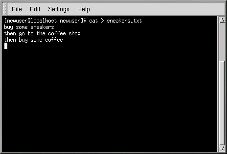 [newuser@localhost newuser]$ cat > sneakers.txt buy some sneakers then go to the coffee shop then buy some coffee |