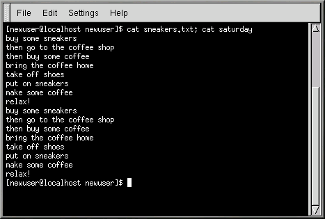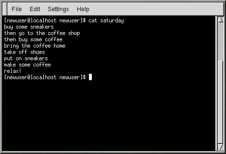[newuser @localhost newuser]$ cat saturday buy some sneakers then go to the coffee shop then buy some coffee bring the coffee home take off shoes put on sneakers make some coffee relax! [newuser @localhost newuser]$ |