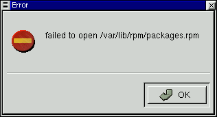 If you're getting an error message similar to failed to open /var/lib/rpm/packages.rpm (see Figure 13-2) it's probably because you do not have the correct permissions set.