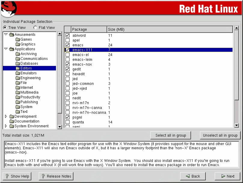 Select each component you wish to install. Selecting Everything (at the end of the component list) during a custom installation installs all packages included with Red Hat Linux. If you select every package, you will need approximately 1.7 GB of free disk space.