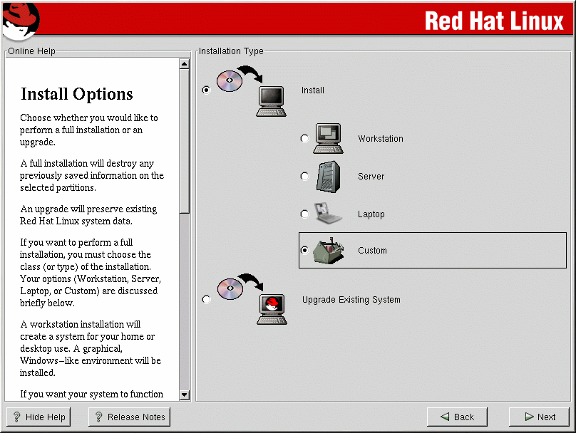 Red Hat Linux allows you to choose the installation type that best fits your needs. Your options are Workstation, Server, Laptop, Custom, and Upgrade.