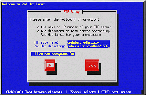 Enter the name or IP address of the FTP site you are installing from, and the name of the directory containing the RedHat installation files for your architecture. For example, if the FTP site contains the directory /mirrors/redhat/i386/RedHat, enter /mirrors/redhat/i386.